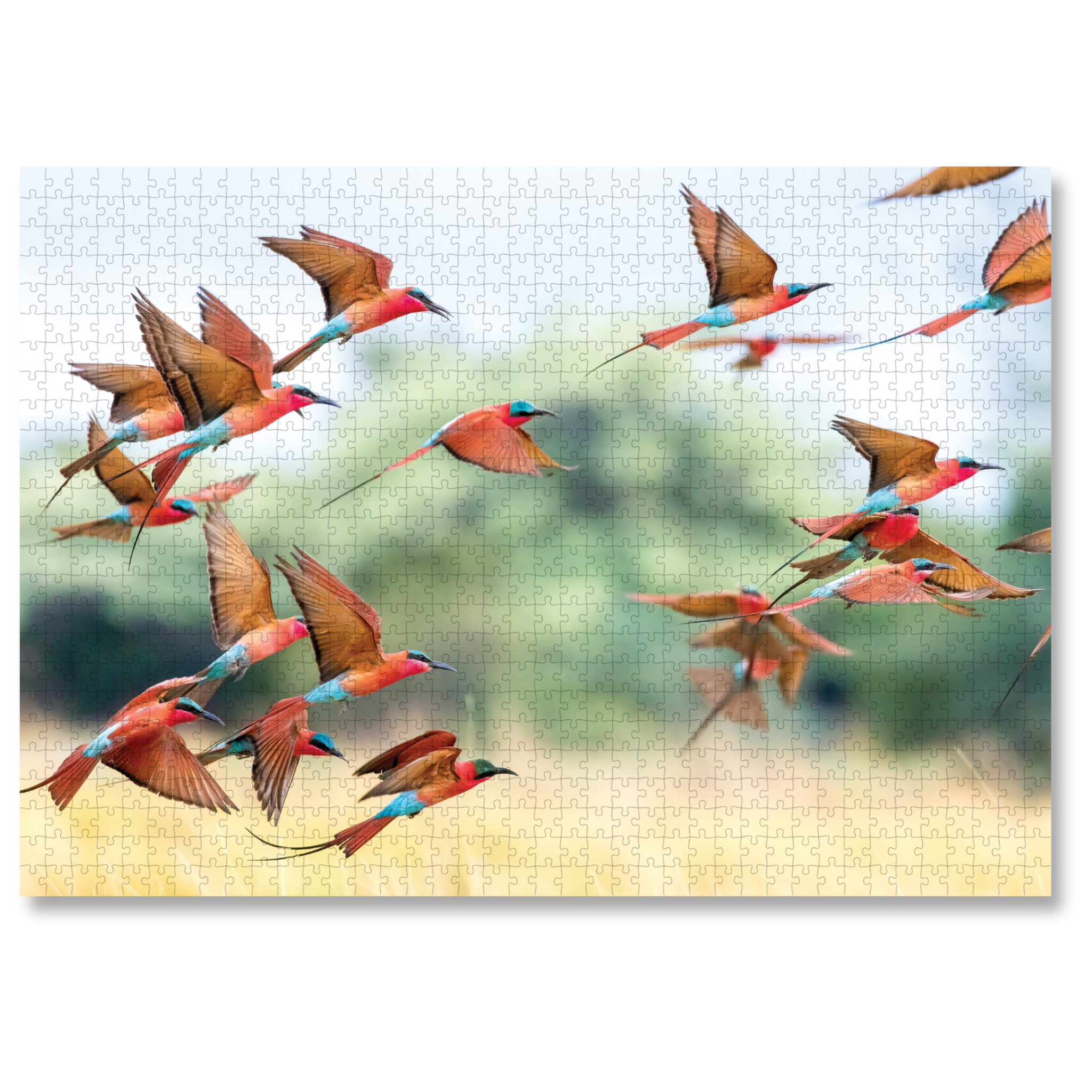 Bee-Eaters In Motion is a MasterPiece wooden jigsaw puzzle that features a beautiful photograph of Southern Carmine Bee-eaters swarming across the sky, taken by local wildlife photographer, Danielle Carstens.